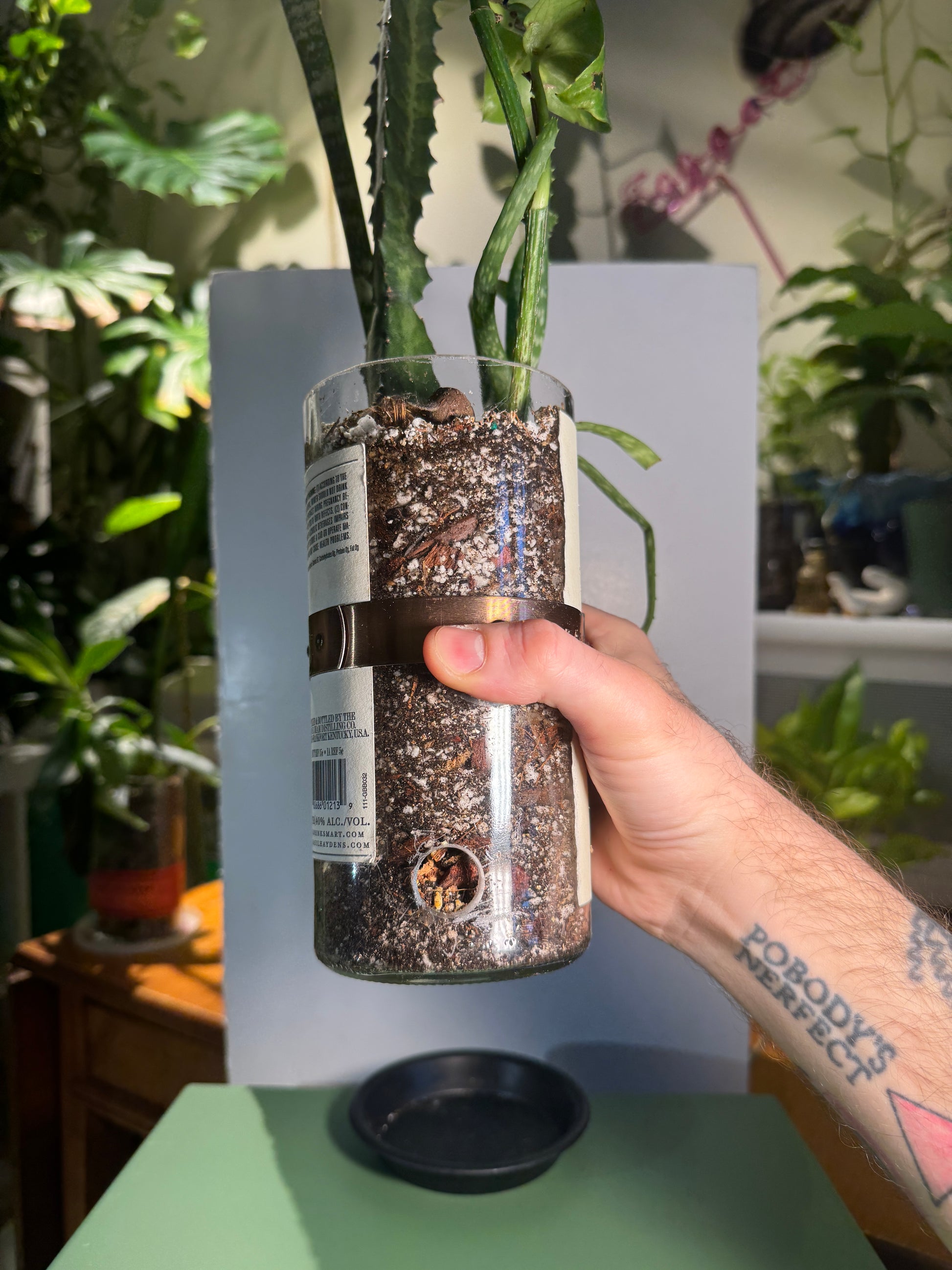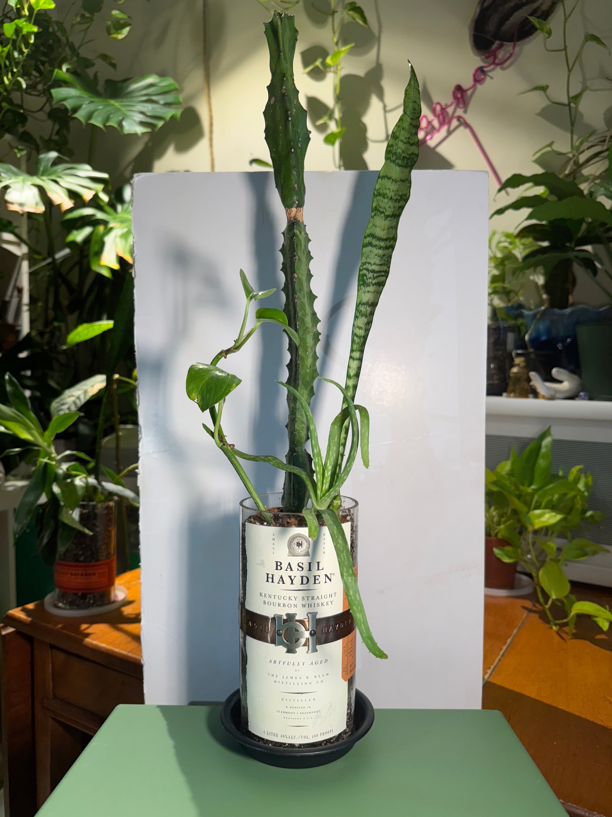 Upcycled Basil Hayden Bourbon Bottle featuring Euphorbia Lactea, Snake Plant, Golden Pothos, Aloe Vera