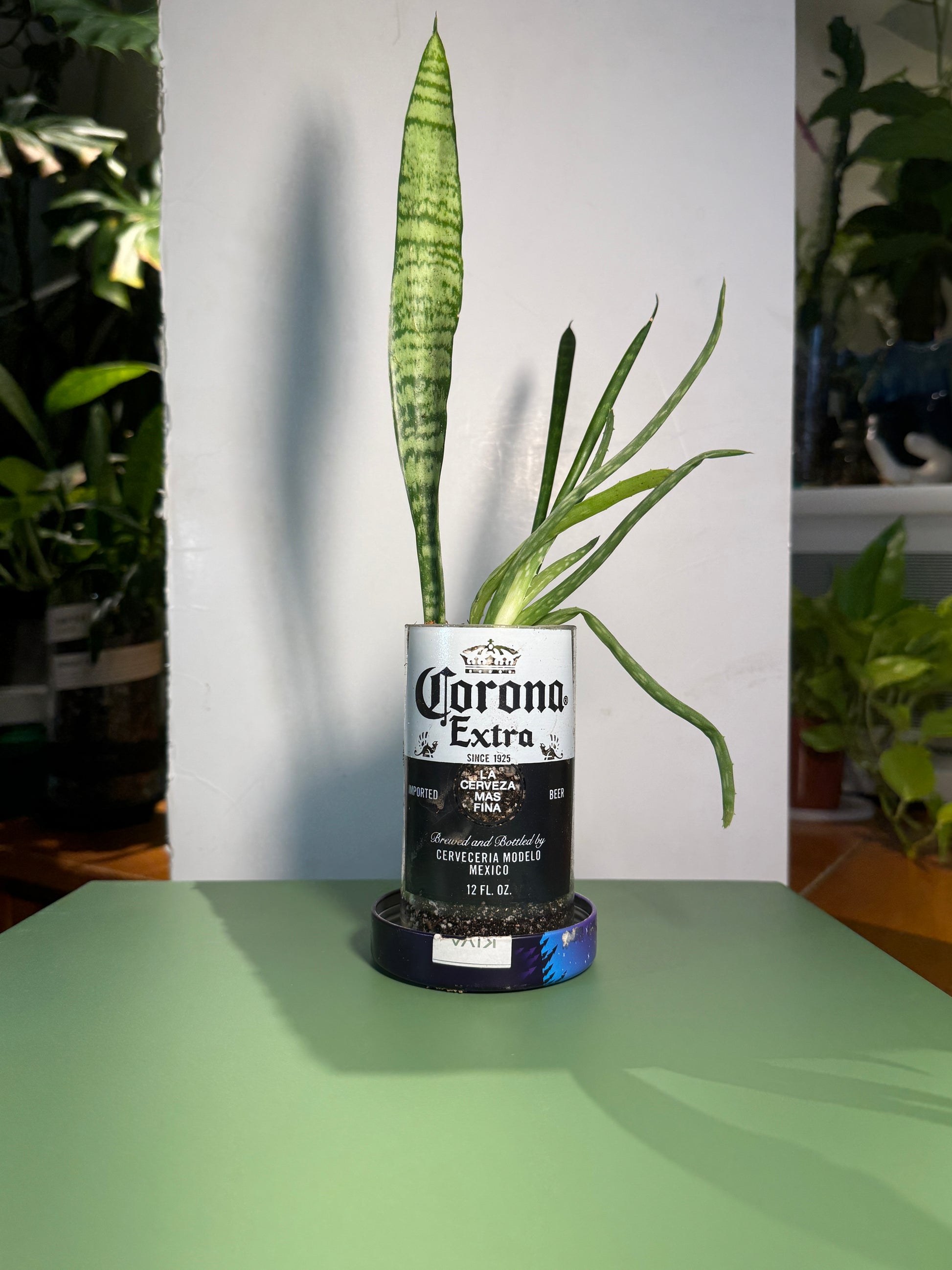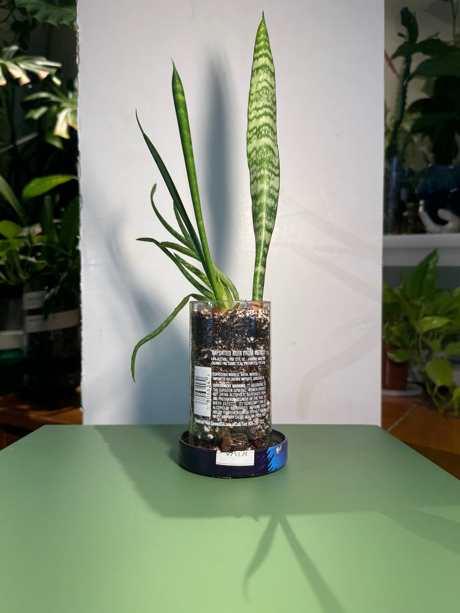 Upcycled Corona Extra bottle featuring Snake Plant, Fernwood Snake Plant, Aloe Vera