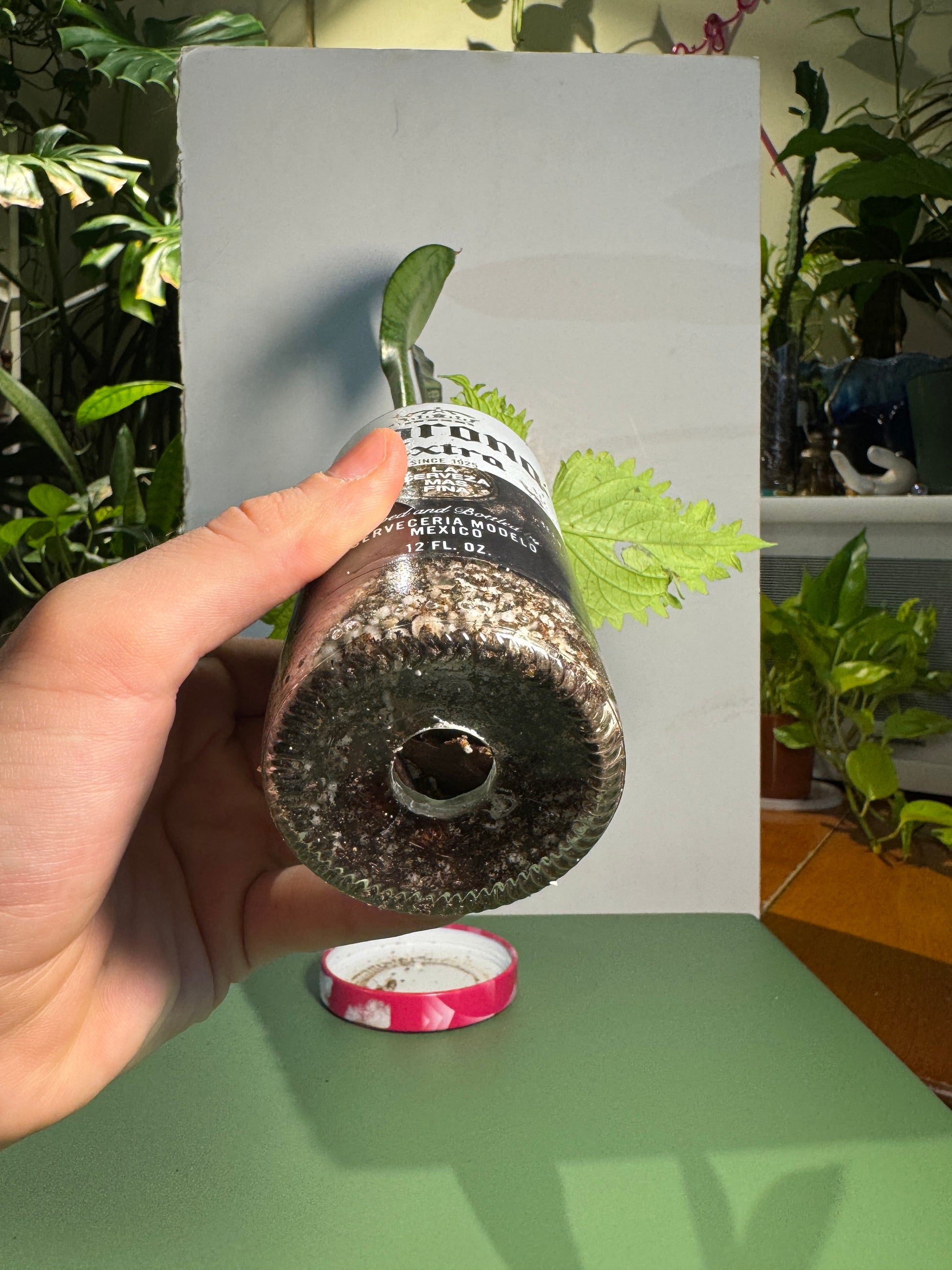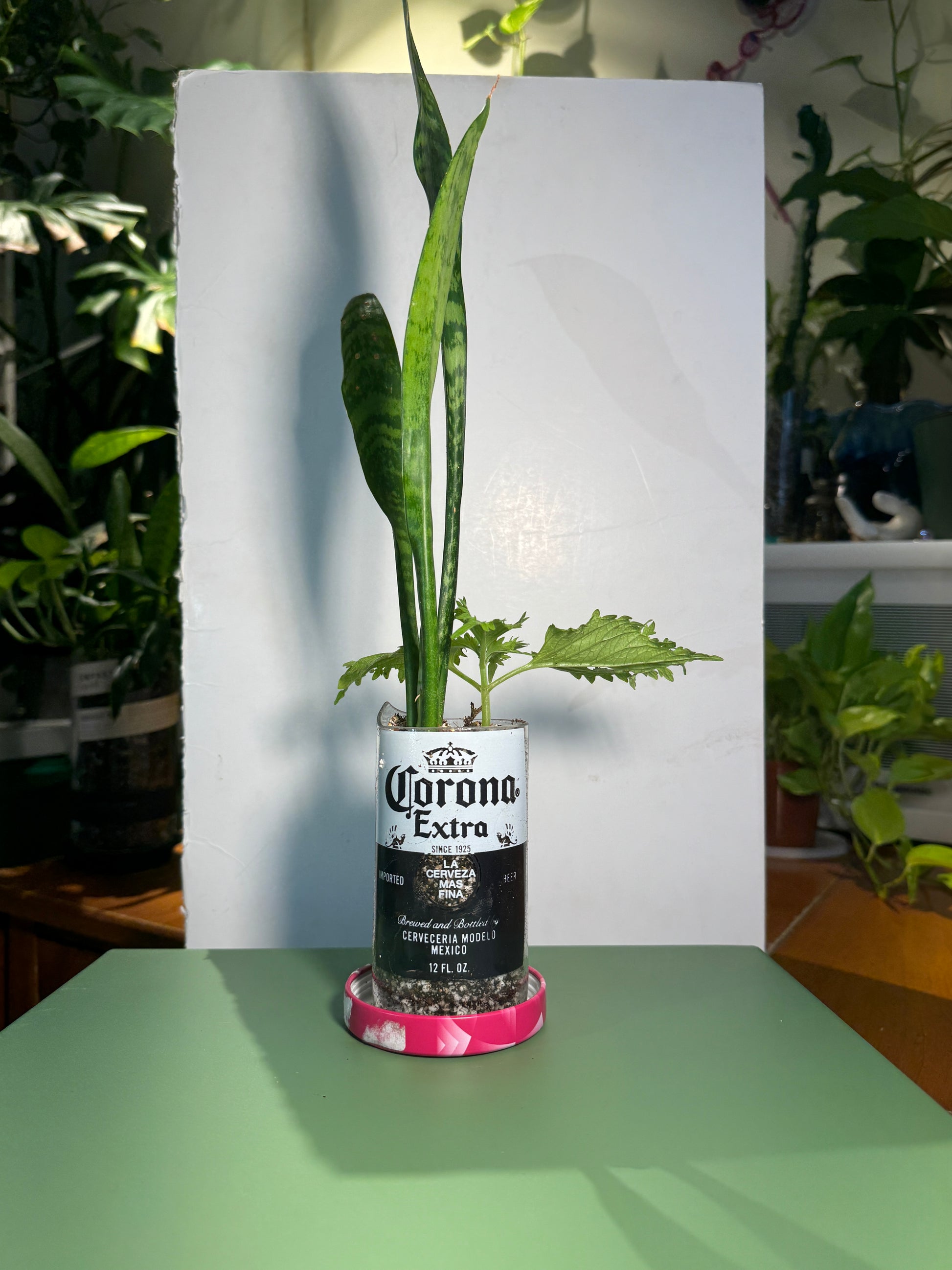Upcycled Corona Extra bottle featuring Snake Plant, Wasabi Coleus