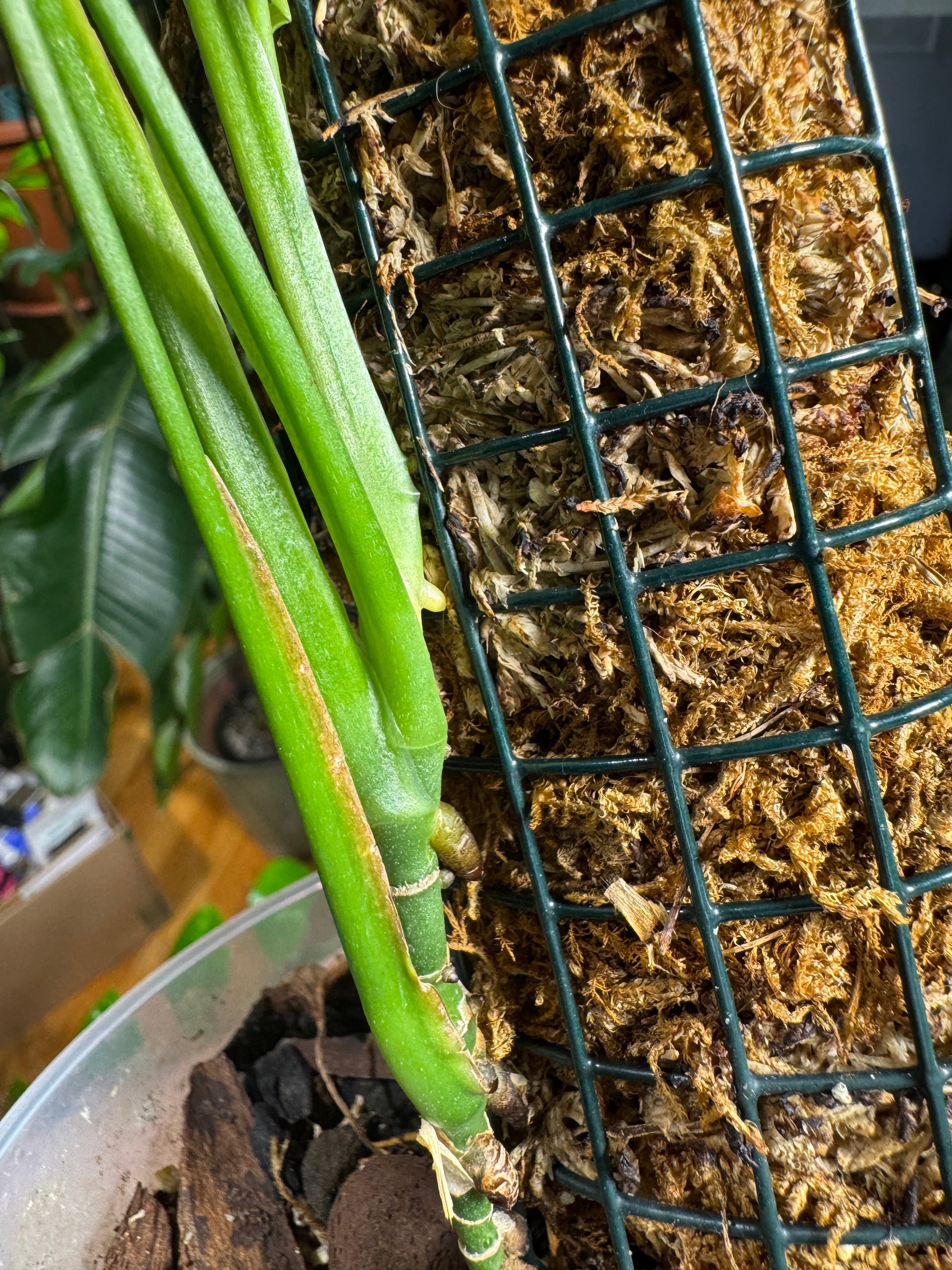 Handmade Sphagnum Moss Pole featuring rubber coated wire mesh and moss, enclosed with trimmed plastic zip ties. 24 in. x 2.5 in. (Plant shown in example is Monstera Obliqua and is not included)
